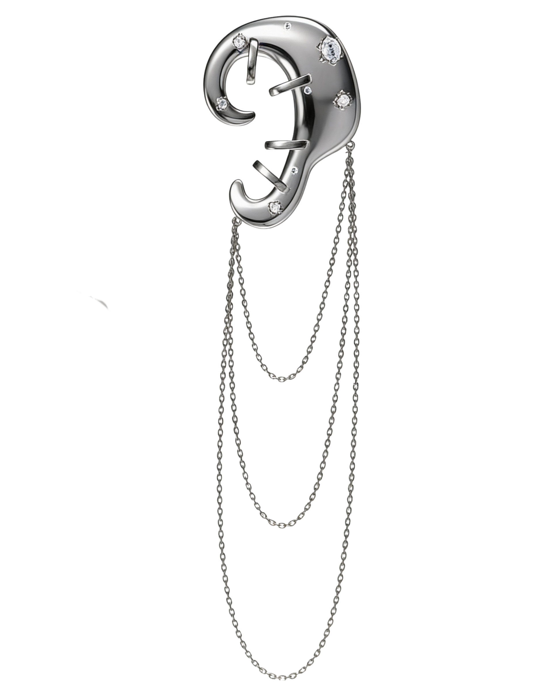 A sculptural statement that wraps the ear in quiet rebellion. The Enchoire Earpiece redefines adornment through fluid architecture and bold asymmetry. Crafted with precision, its form embraces the ear like armor, both delicate and defiant.