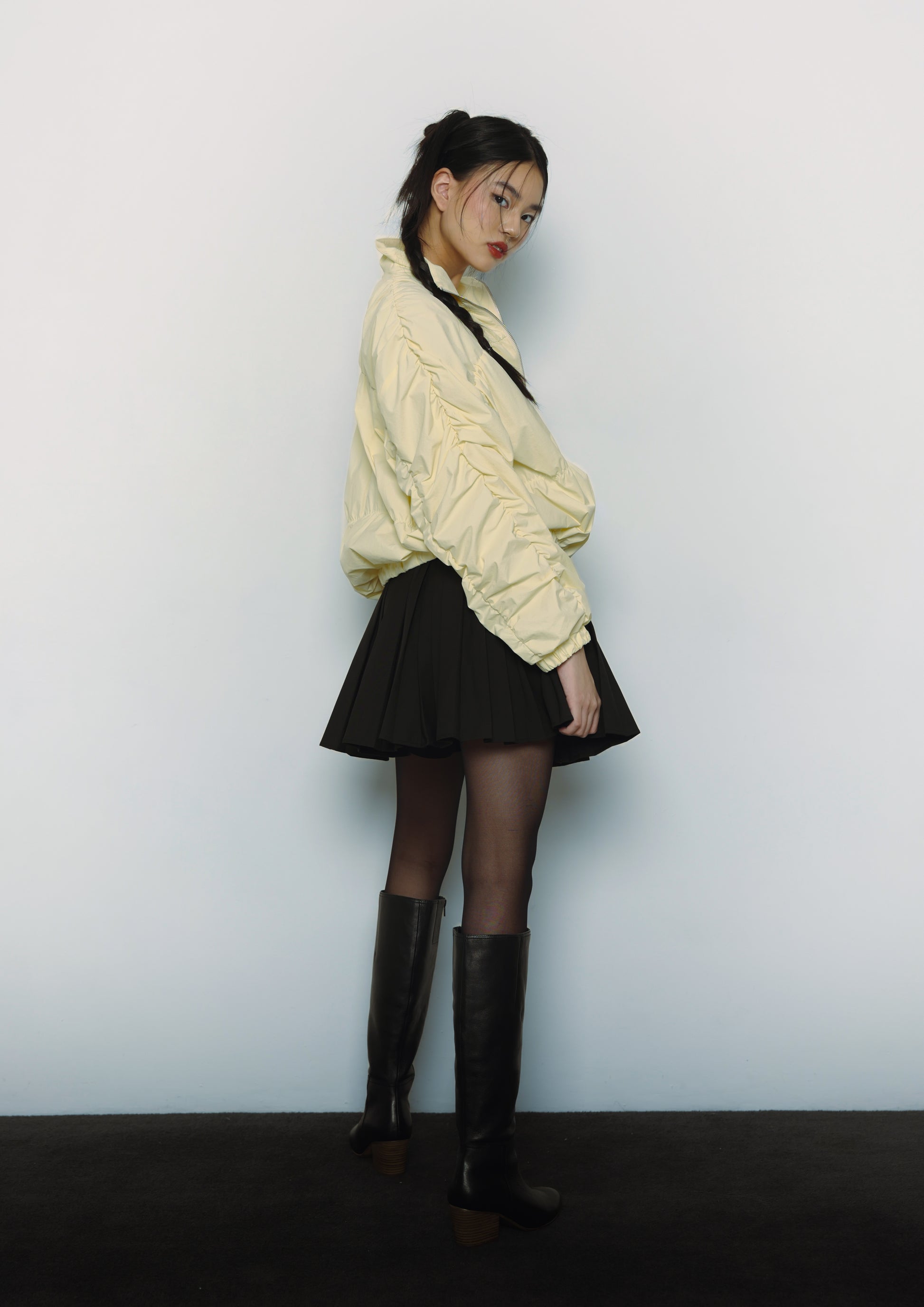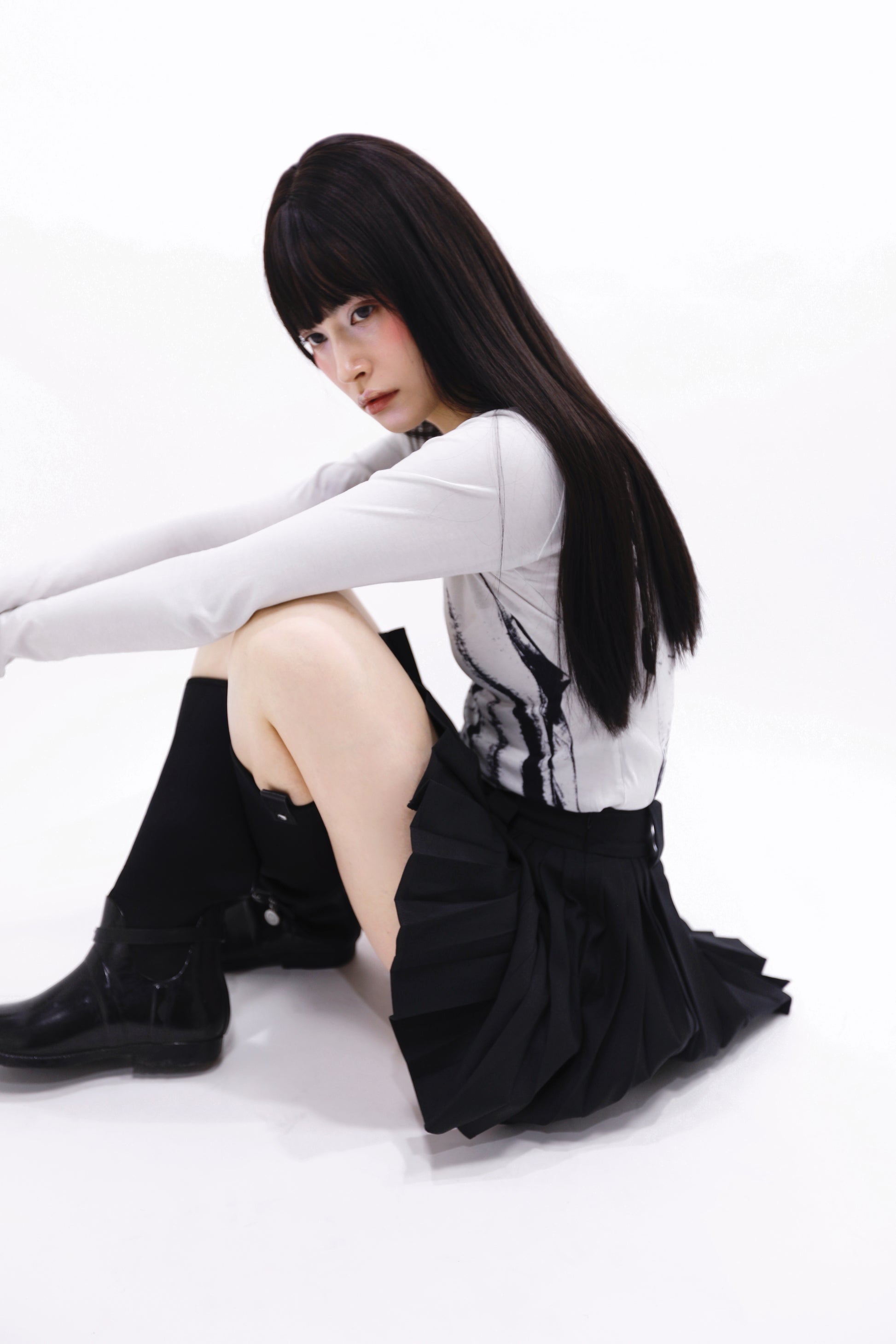 The Roux Skort in black is a quiet rebellion in motion—sharp pleats meet an unexpected edge, with inner shorts shaped like lightning tucked discreetly beneath. Made from a structured yet fluid blend of 80% terylene and 20% rayon, it balances discipline and ease, finished with a tailored waistband and subtle belt loops.